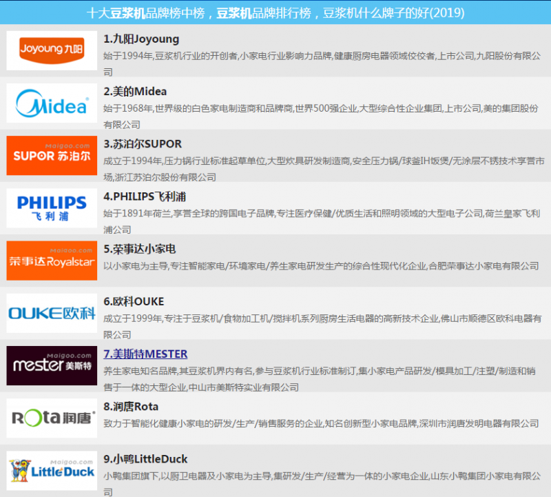 有了豆浆机,在家也能喝到新鲜健康的无添加的豆浆了,现在的豆浆机不仅仅是打豆浆,榨果汁也是很好的。为了给消费者们提供真实的豆浆机市场情况以及准确的行业品牌信息,以下是CNPP提供数据支持,网站为您统计的豆浆机十大品牌榜单及相关品牌推荐,供您参考。