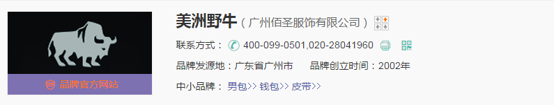 美洲野牛,品牌诞生于2002年,由香港百事如意全球发展公司授权广州佰圣服饰有限公司研发、生产、销售为一体的箱包品牌。品牌专注于为商务男士打造时尚、休闲雅致的商务产品。