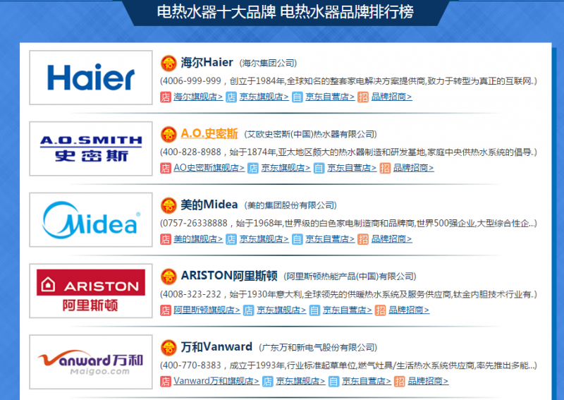 电热水器具有能够即开即热,省时省电,节能环保、体积小巧、水温恒定等诸多优点,不少家庭都选择使用,但电热水器质量参差不齐,使用劣质电热水器存在安全隐患,因此,建议消费者购买知名品牌的产品,那么,电热水器哪个牌子好?电热水器十大品牌有哪些: