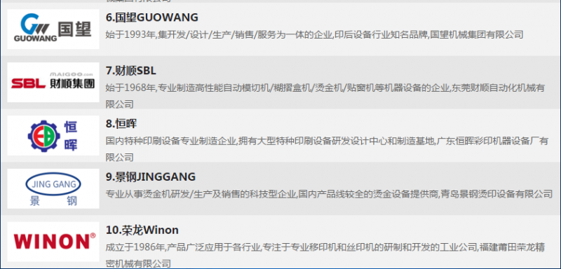 烫金机就是完成烫金工艺的设备。烫金工艺是一种不用油墨的特种印刷工艺,所谓烫金是指在一定的温度和压力下将电化铝箔烫印到承印物表面的工艺过程。那么,烫金机什么牌子好?烫金机什么牌子好?烫金机品牌哪些地区分布的最多?哪里产的烫金机比较好?获得大品牌、著名商标、省市名牌等荣誉的烫金机品牌有哪些?为了给消费者们提供真实的烫金机市场情况以及准确的行业品牌信息,以下是CNPP提供数据支持,网站为您统计的烫金机十大品牌榜单及相关品牌推荐,供您参考。
