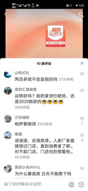 正如4月14日眼镜行业的一场轩然大波,帕莎太阳镜走进了李佳琦的直播间,直播价竟然低于线下零售店的拿货价,瞬间评论区就炸了。