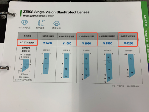 蔡司 1.6、1.74钻立方防蓝光 价格册
