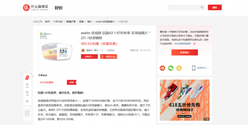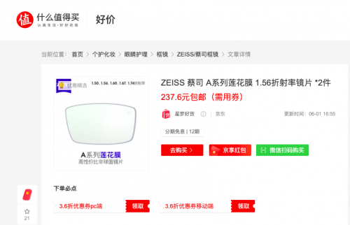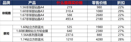 众多进口镜片品牌竟然不约而同地给出了疯狂的折扣,如线下零售价格在980元的依视路1.56非球面钻晶A4镜片,如今在“什么值得买”上面只要219元就可以入手;同样夸张的还有蔡司1.60钻立方防蓝光镜片,线下零售价格为1980元,现在在“什么值得买”上领券后下单价格只要535元!随意搜索依视路和蔡司的几个产品,稍作整理后发现这并不是一个简单的促销活动。