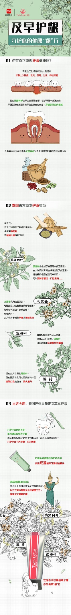 泰国双莲牙膏倡导精细护龈,守护健康“龈”行。及早护龈,避免日后高昂的牙科治疗开支。双莲牙膏专研牙龈清火及消炎,能够有效缓解肿胀、出血、口燥、溃疡等口腔问题,改善口腔微环境。
