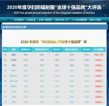 以上评选出来的2020年孕妇防辐射服十大排名品牌,都是当今孕妇防辐射服市场上的佼佼者,都有自己的特点,为广大消费者提供了一份值得信赖的参考资料。