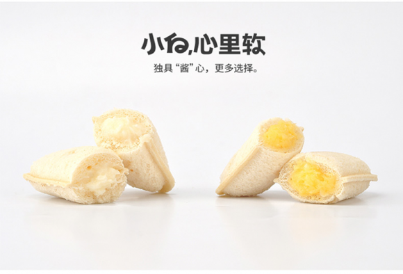 保证营养及便捷的小白心里软植物面包,解决上班族早餐的痛点需求,囊括了上班族对于理想早餐零食的所有期望。小白心里软,一手掌握,体积小巧,口味及营养极其丰富,任君挑选,低热量高能量速食,既适合于在家中食用,也可以再上班路上吃。