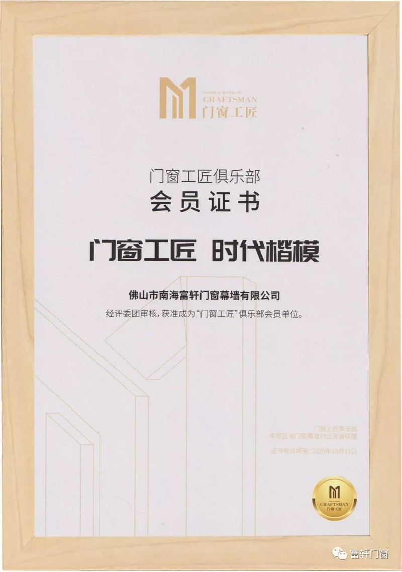 恭喜富轩门窗获颁“门窗工匠”俱乐部会员单位称号
