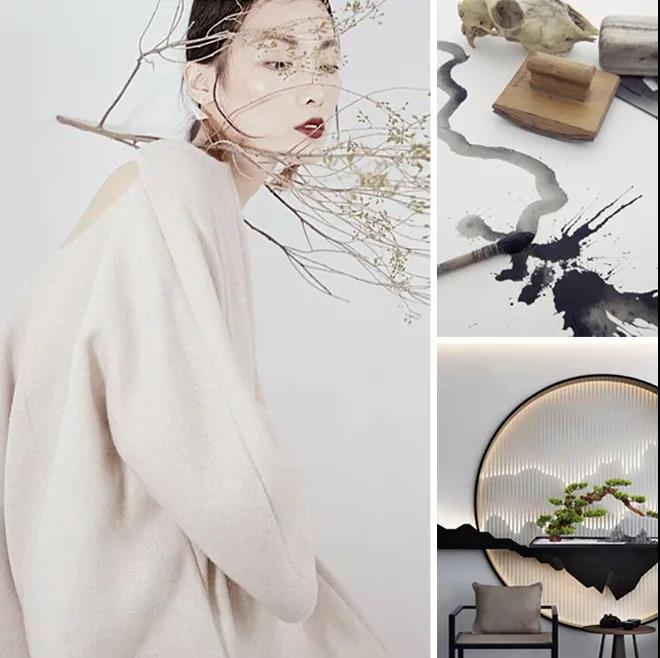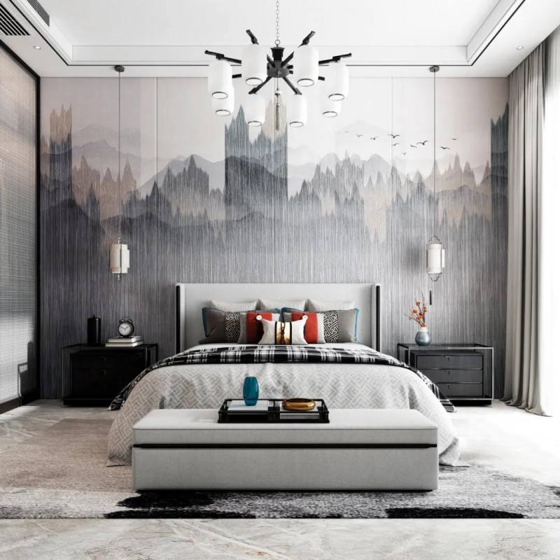 利用深浅不同的山形剪影,相互重叠,适当呈现山的横向连续走向和前后的巨大纵深,使装饰看起来更加立体,将山的连续雄伟走向带入空间,搭配零星的鸟元素,使房间氛围具有广阔的氛围和独特的中国文化魅力。