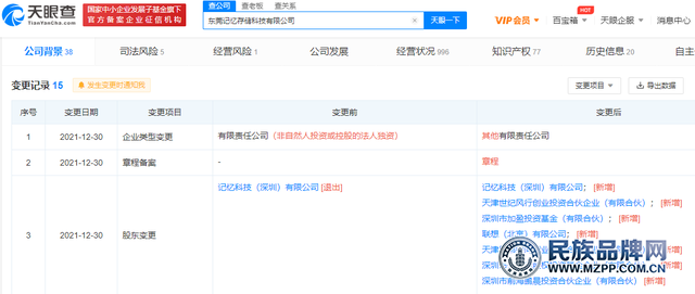 天眼查APP显示,2021年12月30日,东莞记忆存储科技有限公司发生工商变更,新增联想(北京)有限公司等多名股东。该公司成立于2012年,法定代表人为汪洪勇,注册资本2亿元,经营范围包含:调制解调器及其他相关电脑配件的研发及生产,半导体集成电路芯片及计算机软硬件的研发等。东莞记忆存储科技有限公司为记忆科技(深圳)