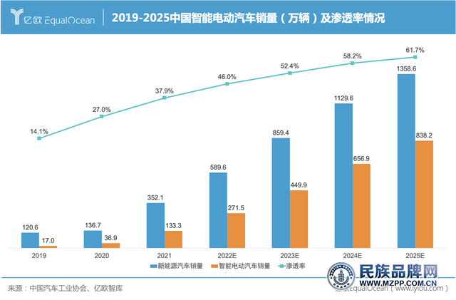 e智库认为,智能技术将不断成熟,并将逐渐渗透到低端机型中。预计到2025年,智能电动汽车销量将达到838.2万辆,占整个电动汽车市场的61.7%。在智能电动车能够普及的过程中,品牌之间的竞争将不可避免。