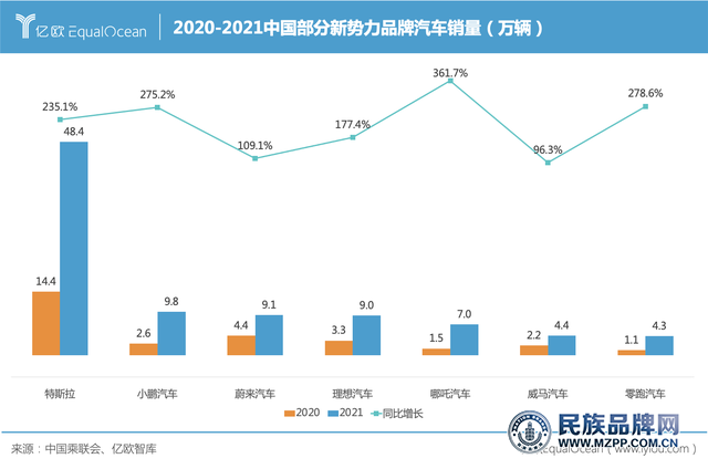 新势力品牌继续冲击传统汽车品牌。从近两年一些新动力品牌的销量来看,2020年品牌间的销量差距并不明显,但2021年特斯拉销量大幅增长,达到48.4万辆,已经拉开了与其他品牌的差距。特斯拉率先“占领”了市场。