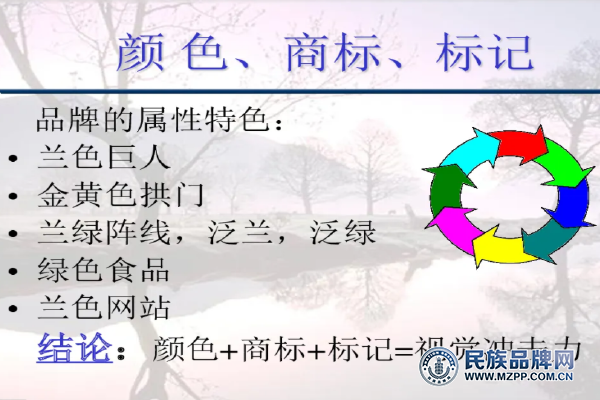 理念:品牌的理念是企业统一的识别标志,但同时也要表明自己独特的个性。品牌的理念是吸引消费者,建立品牌忠诚度,从而为顾客创造品牌(主导地位的理念,品牌的理念是企业倡导的价值目标和行为方式。