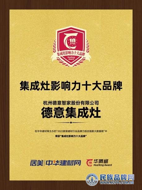 德意集成灶获得“集成灶影响力十大品牌”